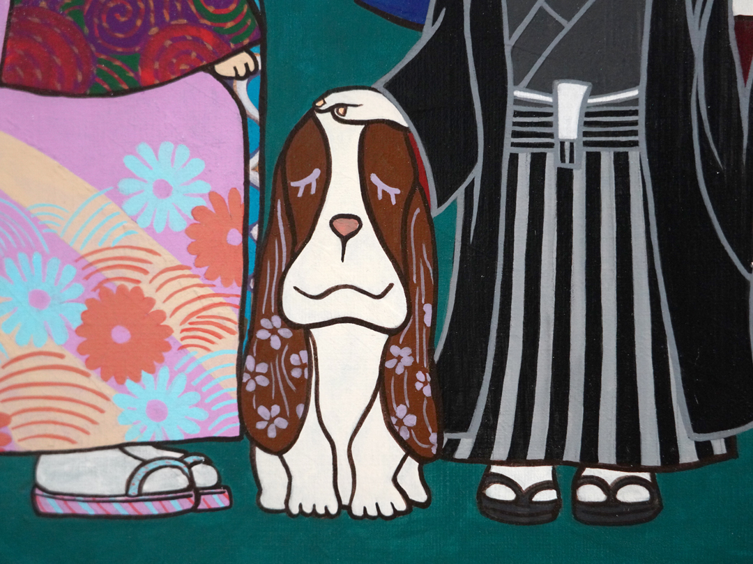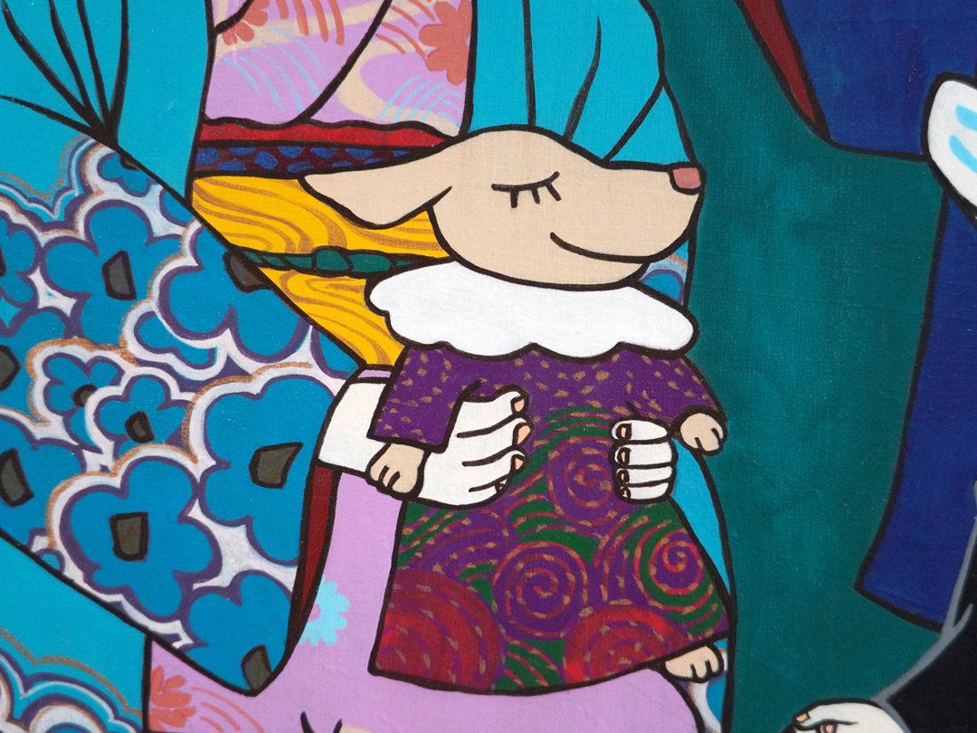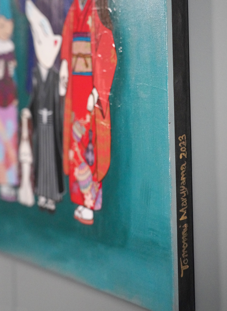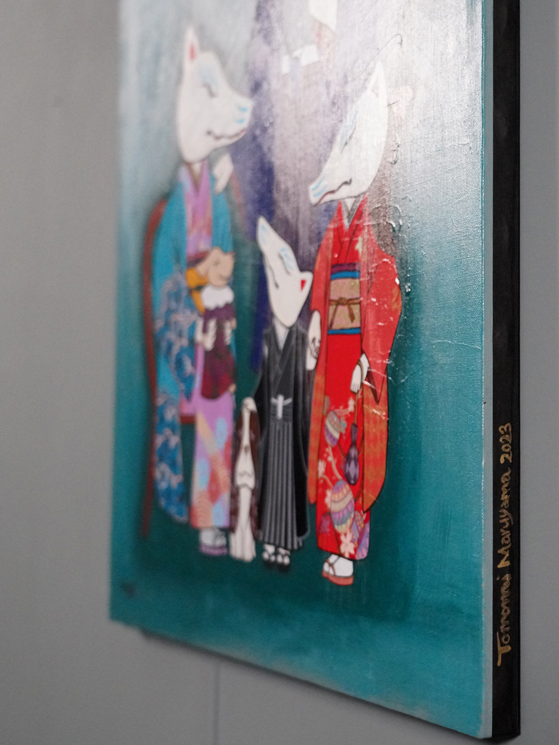 制作年:2023年 サイズ:60.5 W x 72.5 H x 2 D cm 素材:アクリルガッシュ、布キャンバス サインあり、表面保護してありますのでそのまま飾っていただけます。