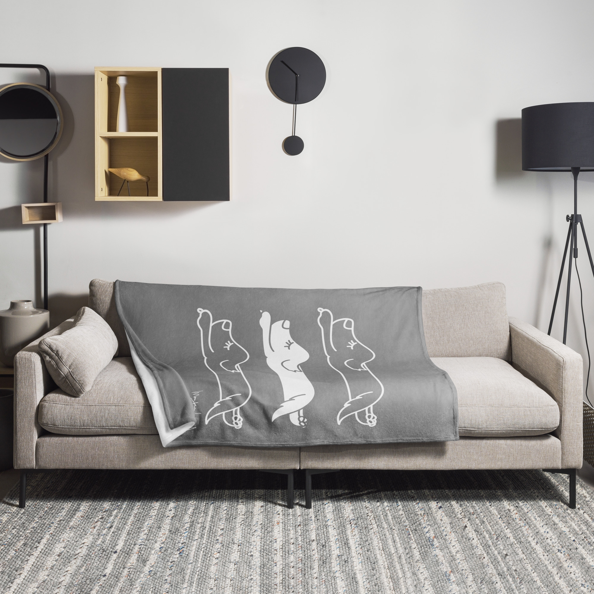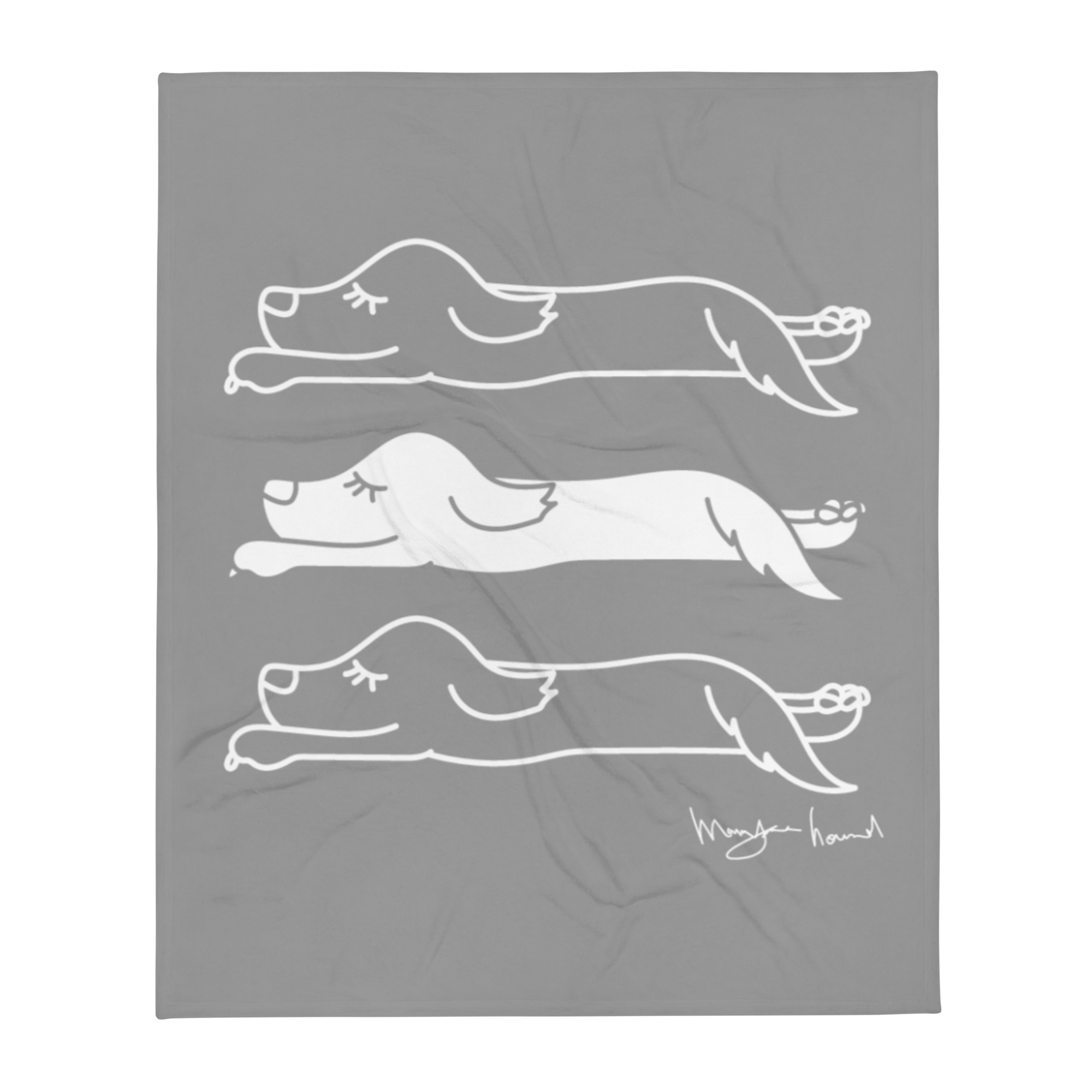 マルヤマトモミの犬のイラストをひざかけにしました。 生地はなんでもおしゃれになるライトグレー。大判のひざ掛けでもリビングのインテリアを邪魔しません。