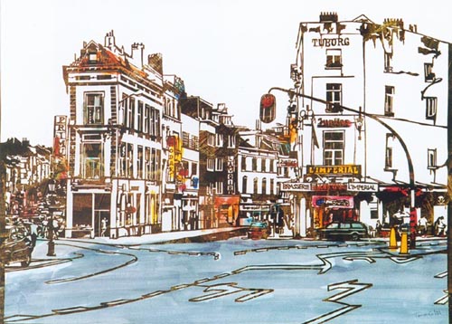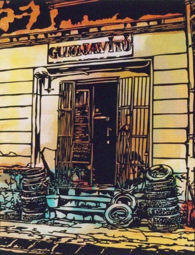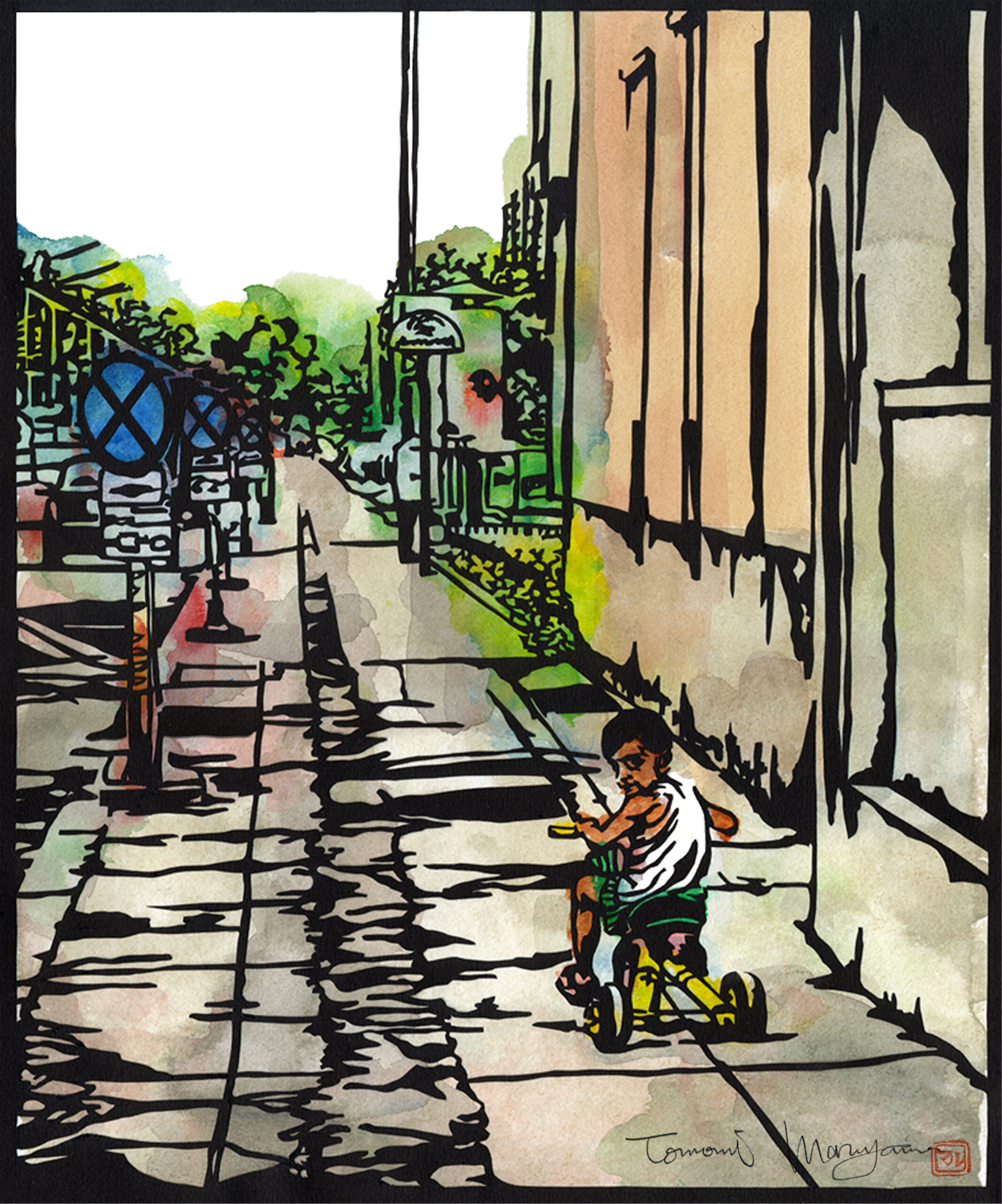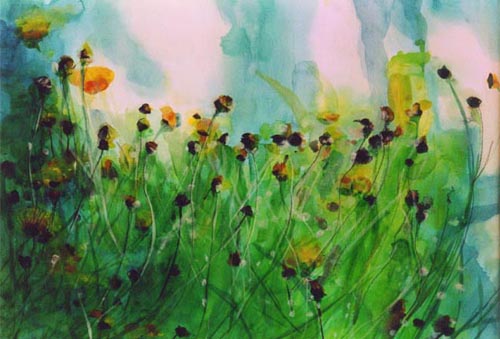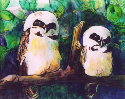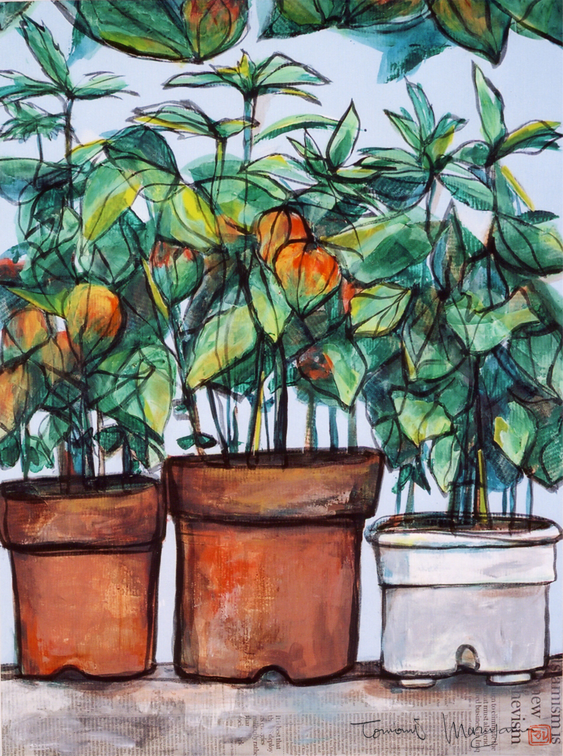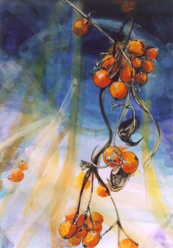 アクリル絵の具は半透明のリキテックスとフラットな色を得意とするガッシュがあり、水彩画のようにぼかしやにじみ、また油絵のようにボリュームのある表現も可能であり、乾くと耐水性になり水彩絵の具より丈夫です。すでに20年保存している作品などもありますが、ほとんど退色もありません。(直射日光に当てる時間や強度にもよります。)実物をご覧になりたい方はご連絡いただければ個別に対応させていただきます。