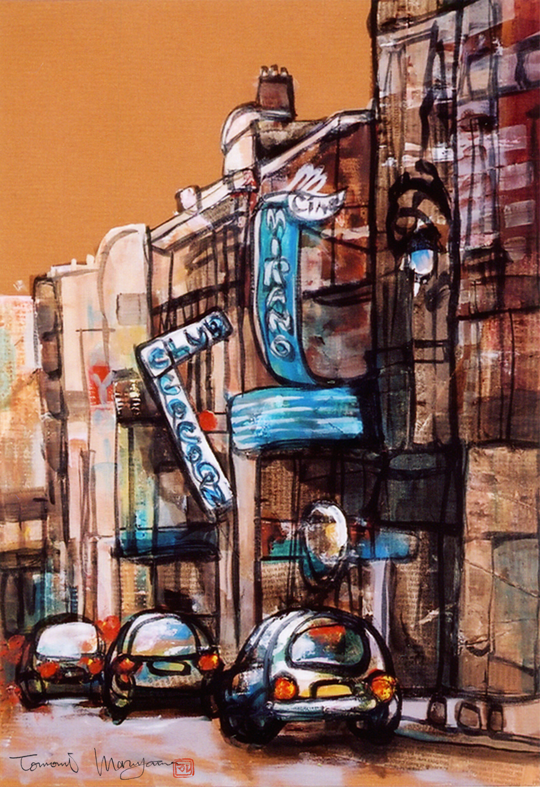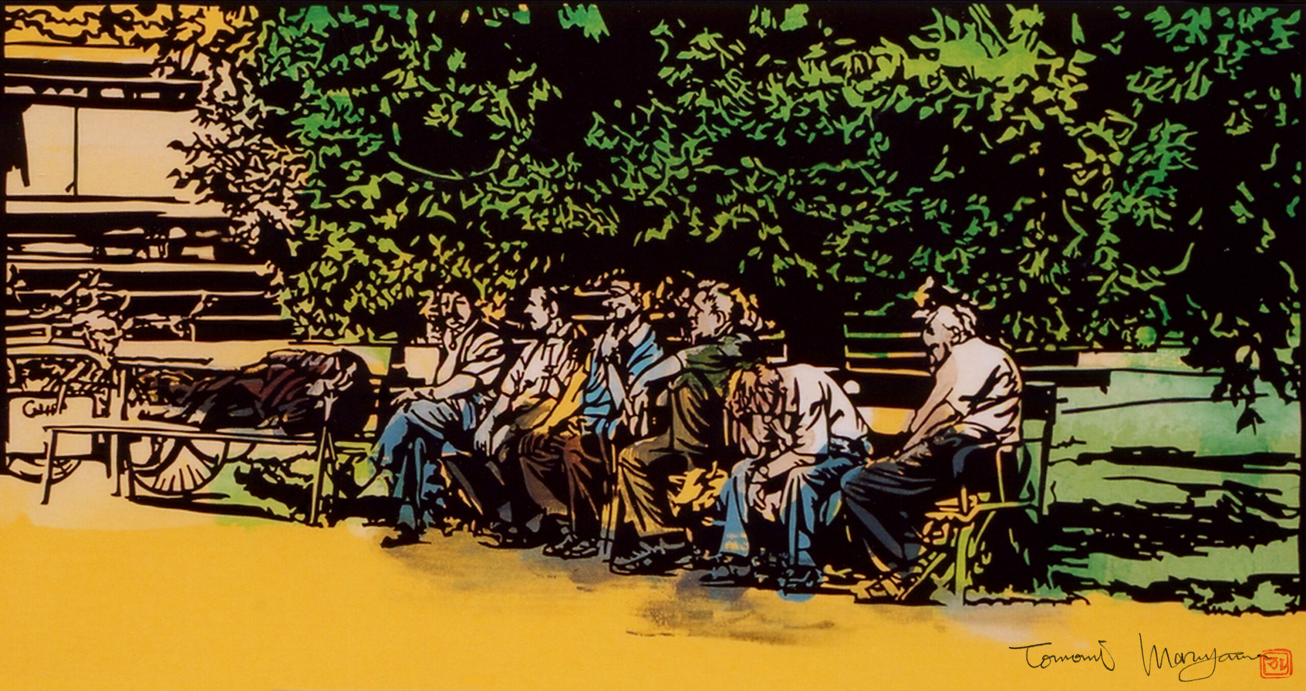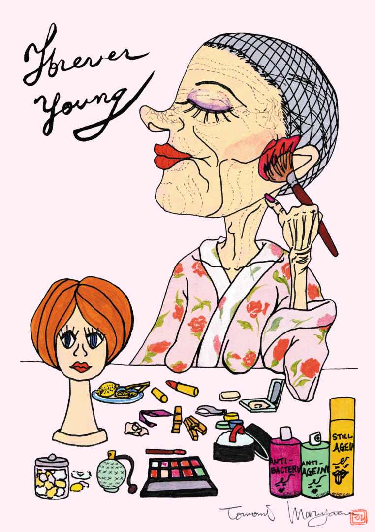 マルヤマの作品はデジタルに思われるものも多数ありますが、写真以外すべて筆や指などの手描き作品です。デジタル化の過程で再現しきれない金色や艶、パールなど実物をご覧にならないとわからないディテールも存在します。テレビで紹介いただいた”老夫婦と犬”シリーズ以外にもコラージュや抽象画なども多数制作しております。