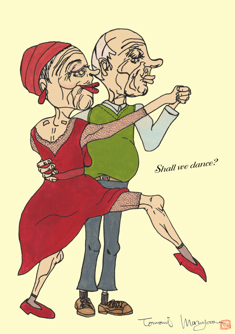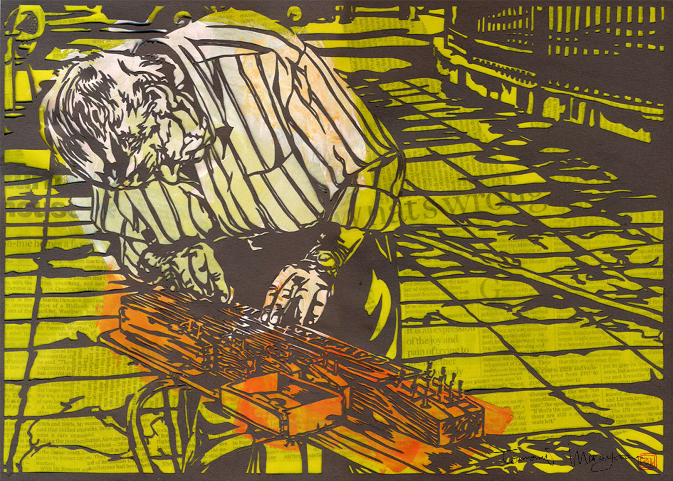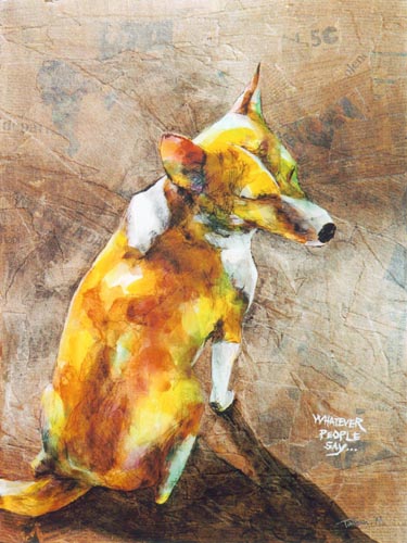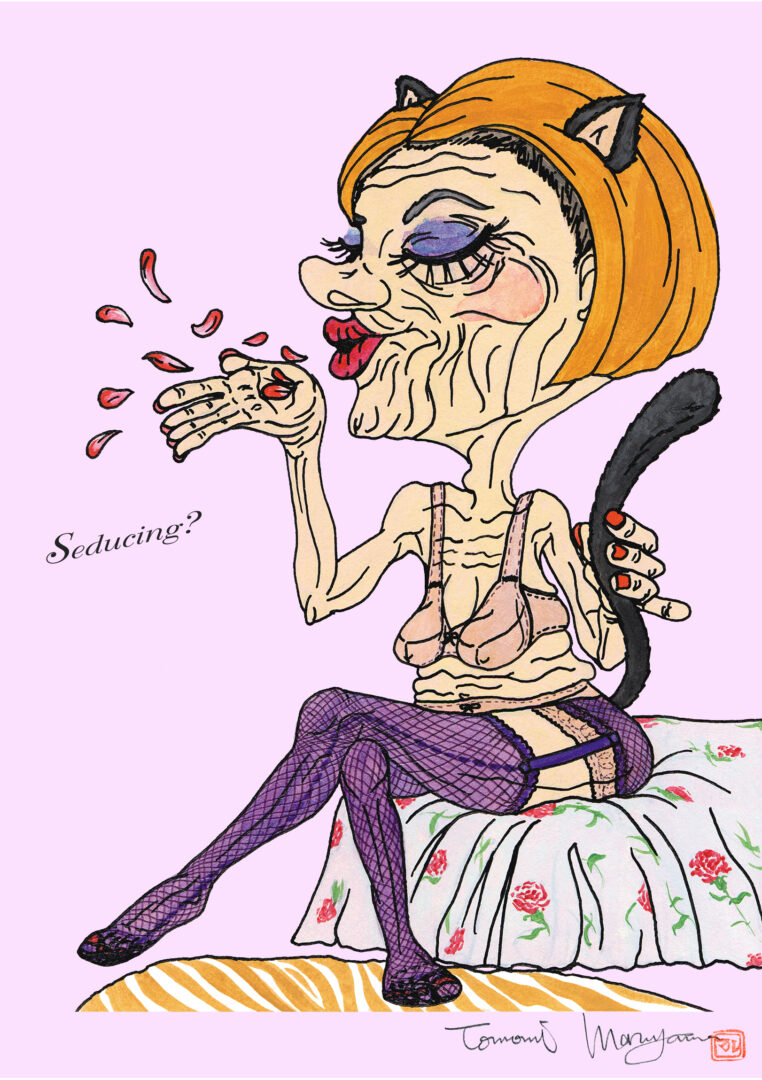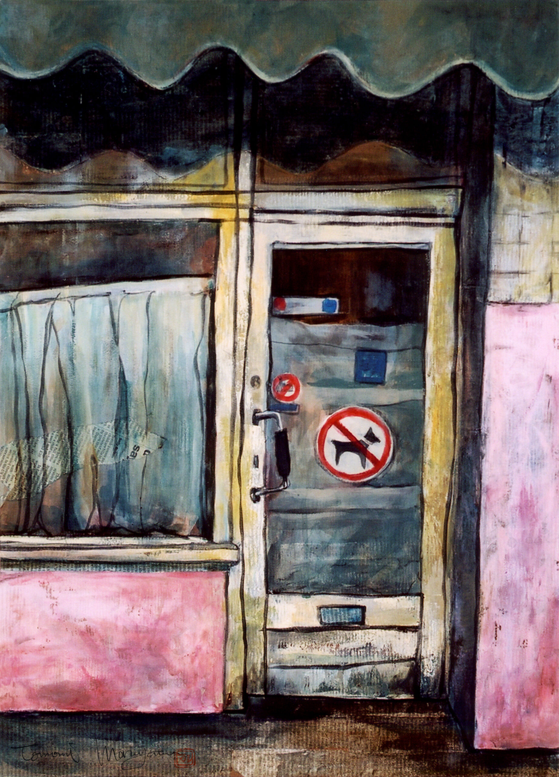 マルヤマの作品はデジタルに思われるものも多数ありますが、写真以外すべて筆や指などの手描き作品です。デジタル化の過程で再現しきれない金色や艶、パールなど実物をご覧にならないとわからないディテールも存在します。テレビで紹介いただいた”老夫婦と犬”シリーズ以外にもコラージュや抽象画なども多数制作しております。