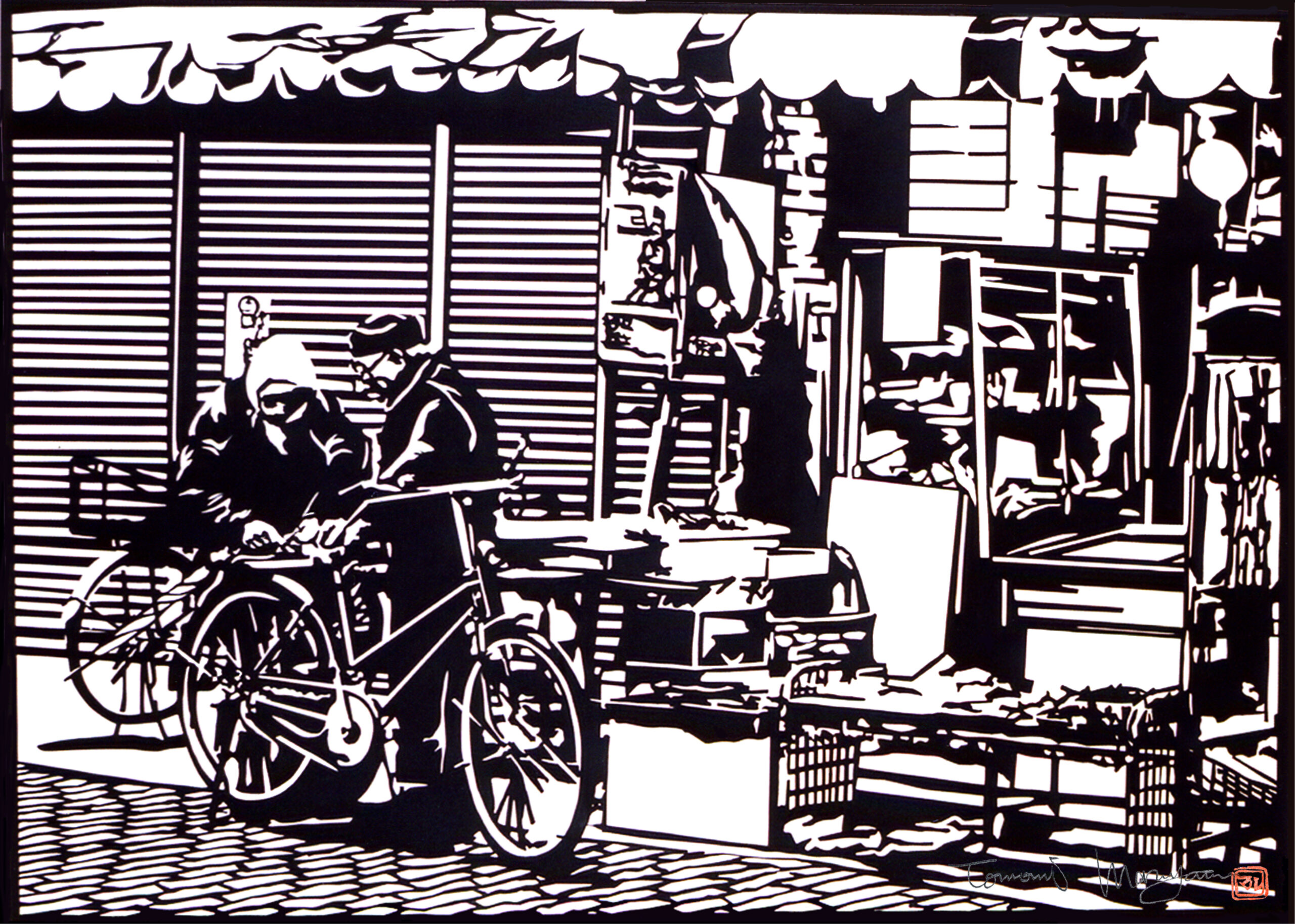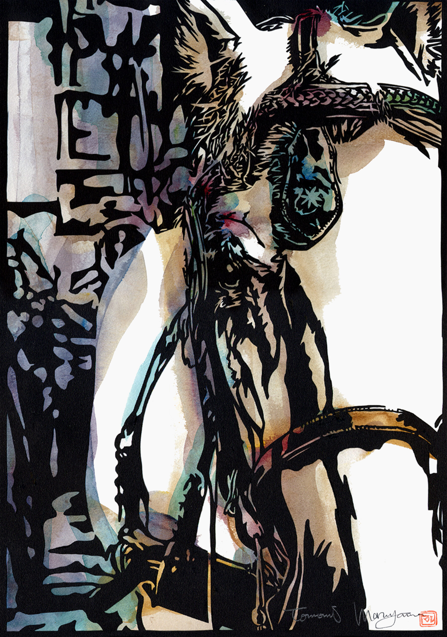 安政3年(1856年)に浮世絵師・三代歌川豊国が描いたとされる岩戸神楽ノ起顕を元にマルヤマの視点で再考・描画した作品。